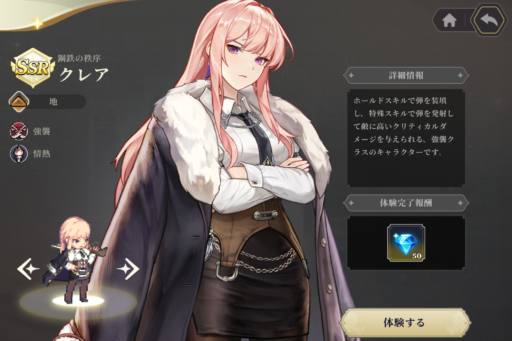 | 制圧または同じ属性の騎士と一緒に編成すると、クレアのクリティカルダメージが40%増加する。 |