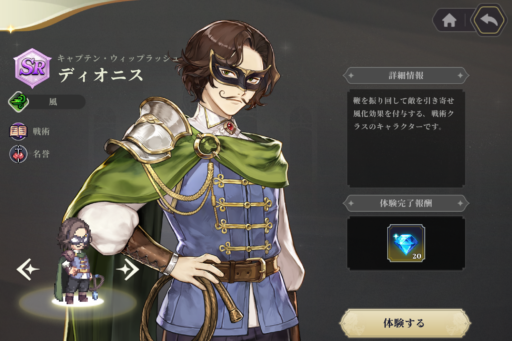 ディオニスが15回ダメージを与えた敵に、12秒間「風の鞭」効果を付与する。 |